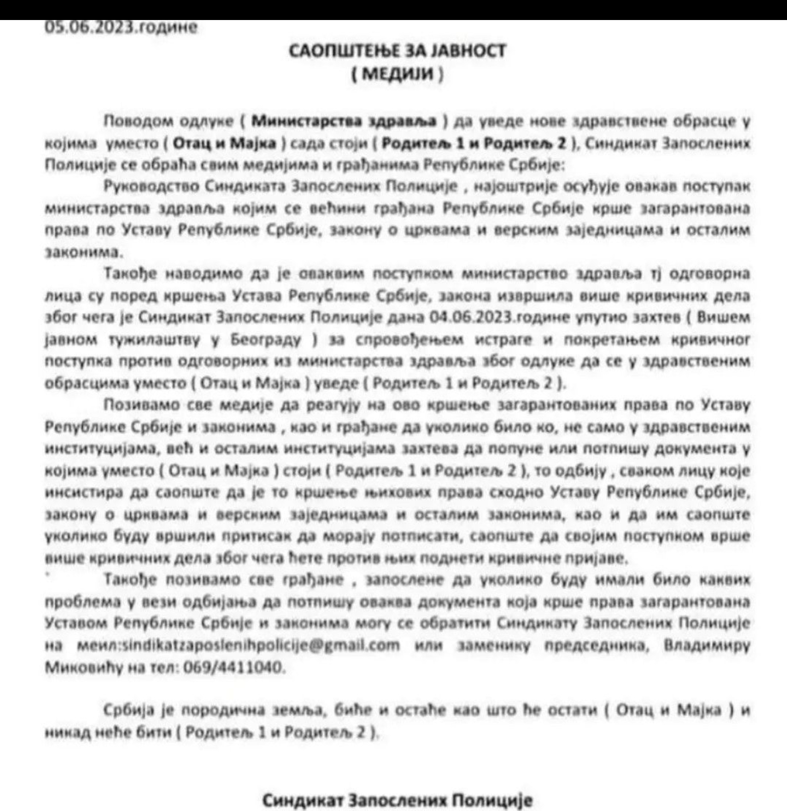 Mup RS, saopštenje povodom “roditelj 1 i 2”